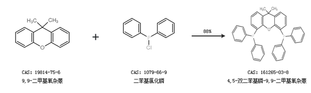 1.通過9,9-二甲基氧雜蒽和二苯基氯化膦合成4,5-雙二苯基膦-9,9-二甲基氧雜蒽,收率約88%;
