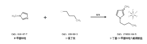 2.通過N-甲基咪唑和1-氯丁烷合成1-丁基-3-甲基咪唑六氟磷酸鹽,收率約92%;
