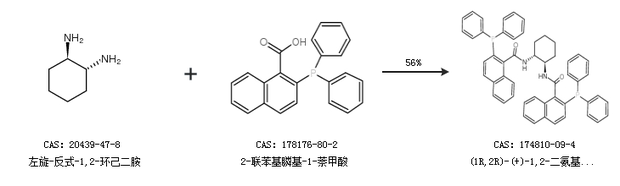 1.通過(guò)左旋-反式-1,2-環(huán)己二胺和2-聯(lián)苯基膦基-1-萘甲酸合成(1R,2R)-(+)-1,2-二氨基環(huán)己烷-N,N′-雙(2-苯基膦-1-萘?;?,收率約56%;