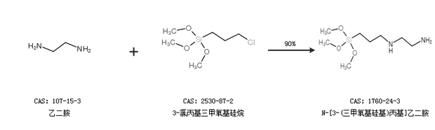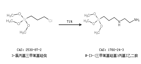 1.通過3-氯丙基三甲氧基硅烷合成N-[3-(三甲氧基硅基)丙基]乙二胺,收率約71%;