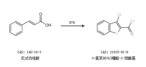 2.通過反式肉桂酸合成3-氯苯并ób]噻酚-2-羰酰氯,收率約87%;