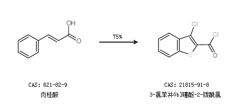 1.通過肉桂酸合成3-氯苯并ób]噻酚-2-羰酰氯,收率約75%;