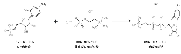 1.通過(guò)5''-胞苷酸和氯化磷酰膽堿鈣鹽合成胞磷膽堿鈉