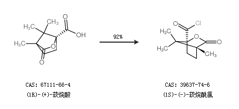 1.通過(guò)(1R)-(+)-莰烷酸合成(1S)-(-)-莰烷酰氯,收率約92%;