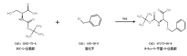 1.通過(guò)BOC-L-絲氨酸和溴化芐合成N-Boc-O-芐基-D-絲氨酸,收率約75%;
