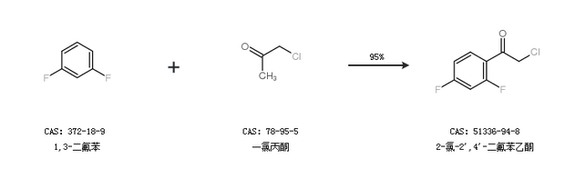 2.通過1,3-二氟苯和一氯丙酮合成2-氯-2'',4''-二氟苯乙酮,收率約95%;