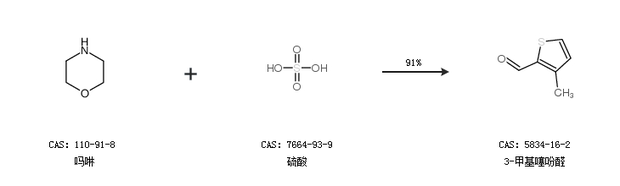 1.通過嗎啉和硫酸合成3-甲基噻吩醛,收率約91%;