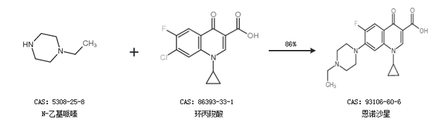 1.通過N-乙基哌嗪和環(huán)丙羧酸合成恩諾沙星,收率約83%;