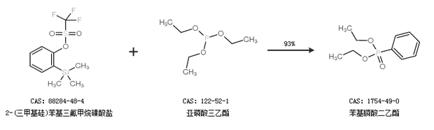 2.通過2-(三甲基硅)苯基三氟甲烷磺酸鹽和亞磷酸三乙酯合成苯基膦酸二乙酯,收率約93%;