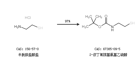 1.通過半胱胺鹽酸鹽合成2-叔丁氧羰基氨基乙硫醇,收率約97%;