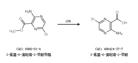 1.通過3-氨基-6-溴吡嗪-2-甲酸甲酯合成3-氨基-6-溴吡嗪-2-甲酸,收率約10%;