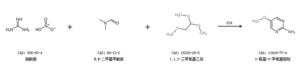 1.通過(guò)硝酸胍、N,N-二甲基甲酰胺和1,1,2-三甲氧基乙烷合成2-氨基-5-甲氧基嘧啶,收率約51%;