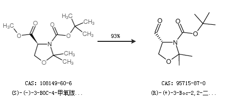1.通過(guò)(S)-(-)-3-BOC-4-甲氧羰基-2,2-二甲基-1,3-惡唑烷合成(R)-(+)-3-Boc-2,2-二甲基噁唑啉-4-甲醛,收率約93%;