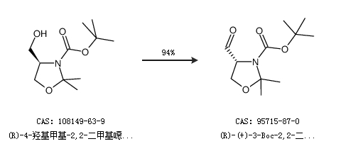 2.通過(guò)(R)-4-羥基甲基-2,2-二甲基噁唑啉-3-羧酸叔丁酯合成(R)-(+)-3-Boc-2,2-二甲基噁唑啉-4-甲醛,收率約94%;
