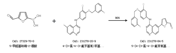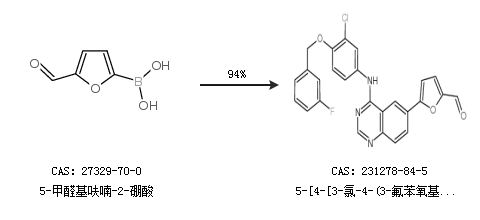 2.通過5-甲醛基呋喃-2-硼酸合成5-[4-[3-氯-4-(3-氟苯氧基)苯胺基]-6-喹唑啉基]呋喃-2-甲醛,收率約94%;