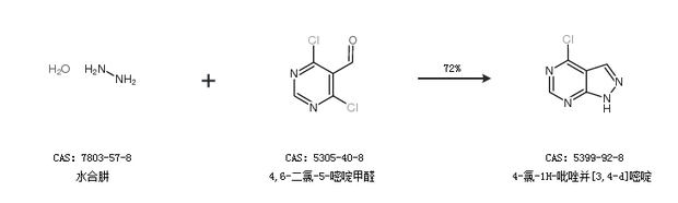 2.通過(guò)水合肼和4,6-二氯-5-嘧啶甲醛合成4-氯-1H-吡唑并[3,4-d]嘧啶,收率約72%;