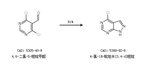 1.通過(guò)4,6-二氯-5-嘧啶甲醛合成4-氯-1H-吡唑并[3,4-d]嘧啶,收率約81%;