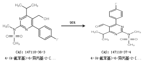 2.通過(guò)4-(4-氟苯基)-6-異丙基-2-[(N-甲基-N-甲磺酰)氨基]嘧啶-5-甲醇合成4-(4-氟苯基)-6-異丙基-2-[(N-甲基-N-甲磺酰)氨基]嘧啶-5-甲醛,收率約96%;
