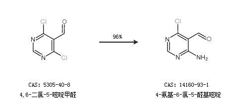 1.通過(guò)4,6-二氯-5-嘧啶甲醛合成4-氨基-6-氯-5-醛基嘧啶,收率約96%;