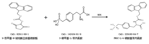 1.通過9-芴甲基-N-琥珀酰亞胺基碳酸酯和3-磷甲基-L-苯丙氨酸合成FMOC-L-4-磷酸基苯丙氨酸,收率約96%;