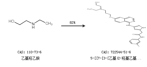 1.通過(guò)乙基羥乙胺合成5-[[7-[3-[乙基(2-羥基乙基)氨基]丙氧基]-4-喹唑啉]氨基]-N-(3-氟苯基)-1H-吡唑-3-乙酰胺,收率約82%;