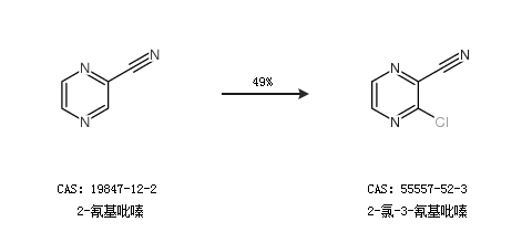 1.通過2-氰基吡嗪合成2-氯-3-氰基吡嗪,收率約49%;