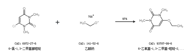 2.通過6-氯-1,3-二甲基脲嘧啶和乙醇鈉合成6-乙氧基-1,3-二甲基-嘧啶-2,4-二酮,收率約97%;