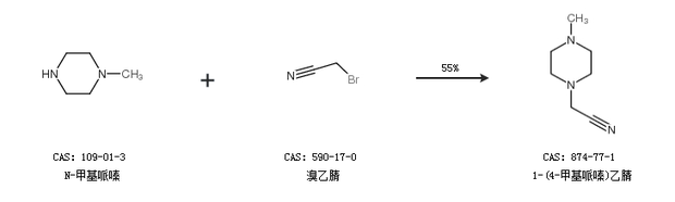 2.通過N-甲基哌嗪和溴乙腈合成1-(4-甲基哌嗪)乙腈,收率約55%;