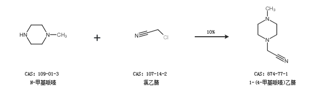 1.通過N-甲基哌嗪和氯乙腈合成1-(4-甲基哌嗪)乙腈,收率約10%;