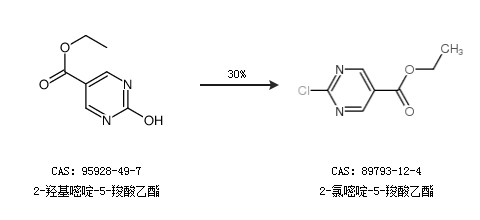 1.通過2-羥基嘧啶-5-羧酸乙酯合成2-氯嘧啶-5-羧酸乙酯,收率約30%;