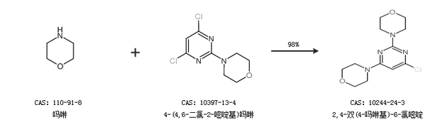 2.通過(guò)嗎啉和4-(4,6-二氯-2-嘧啶基)嗎啉合成2,4-雙(4-嗎啉基)-6-氯嘧啶,收率約98%;
