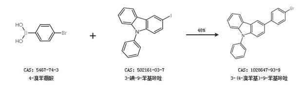 2.通過4-溴苯硼酸和3-碘-9-苯基咔唑合成3-(4-溴苯基)-9-苯基咔唑,收率約48%;