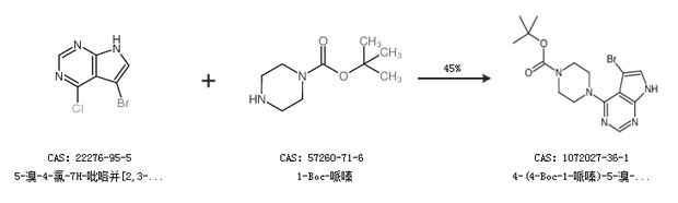 1.通過(guò)5-溴-4-氯-7H-吡咯并[2,3-d]嘧啶和1-Boc-哌嗪合成4-(4-Boc-1-哌嗪)-5-溴-7H-吡咯并[2,3-d]嘧啶,收率約45%;