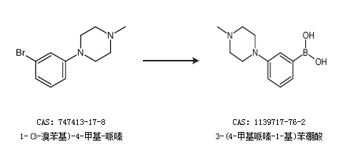 1.通過(guò)1-(3-溴苯基)-4-甲基-哌嗪和硼酸三異丙酯合成3-(4-甲基哌嗪-1-基)苯硼酸,收率約25%;