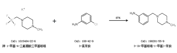 2.通過鉀 1-甲基-4-三氟硼酸三甲基哌嗪和3-氯苯胺合成3-(4-甲基哌嗪-1-甲基)-苯胺,收率約87%;