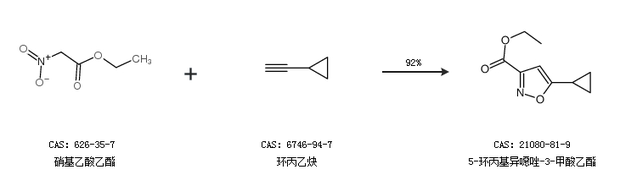 1.通過(guò)硝基乙酸乙酯和環(huán)丙乙炔合成5-環(huán)丙基異噁唑-3-甲酸乙酯,收率約92%;