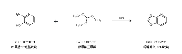 2.通過2-氨基-3-羥基吡啶和原甲酸三甲酯合成噁唑并[4,5-b]吡啶,收率約81%;