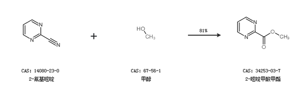 1.通過2-氰基嘧啶和甲醇合成2-嘧啶甲酸甲酯,收率約81%;