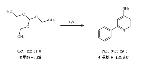 2.通過(guò)原甲酸三乙酯合成4-氨基-6-苯基嘧啶,收率約49%;