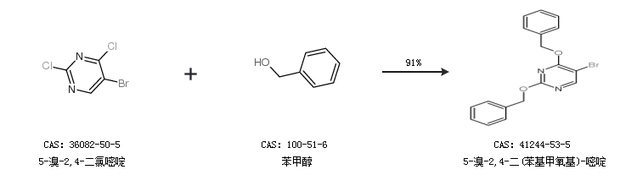1.通過5-溴-2,4-二氯嘧啶和苯甲醇合成5-溴-2,4-二(苯基甲氧基)-嘧啶,收率約91%;
