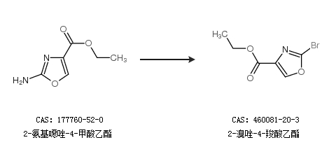 1.通過2-氨基噁唑-4-甲酸乙酯合成2-溴唑-4-羧酸乙酯,收率約20%;