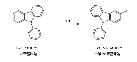 2.通過9-苯基咔唑合成3-碘-9-苯基咔唑,收率約80%;
