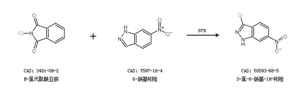 2.通過N-氯代酞酰亞胺和6-硝基吲唑合成3-氯-6-硝基-1H-吲唑,收率約87%;