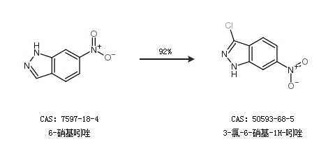 1.通過6-硝基吲唑合成3-氯-6-硝基-1H-吲唑,收率約92%;