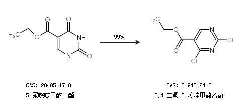 1.通過(guò)5-尿嘧啶甲酸乙酯合成2,4-二氯-5-嘧啶甲酸乙酯,收率約99%;