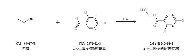 2.通過(guò)乙醇和2,4-二氯-5-嘧啶甲酰氯合成2,4-二氯-5-嘧啶甲酸乙酯,收率約10%;