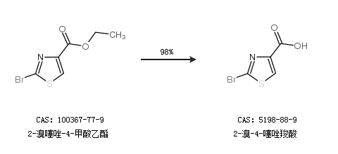 1.通過(guò)2-溴噻唑-4-甲酸乙酯合成2-溴-4-噻唑羧酸,收率約98%;