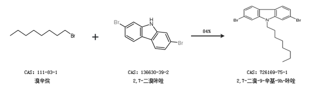 1.通過溴辛烷和2,7-二溴咔唑合成2,7-二溴-9-辛基-9h-咔唑,收率約84%;