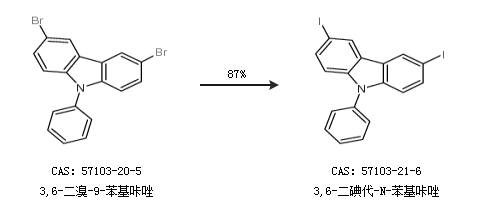 2.通過(guò)3,6-二溴-9-苯基咔唑合成3,6-二碘代-N-苯基咔唑,收率約87%;