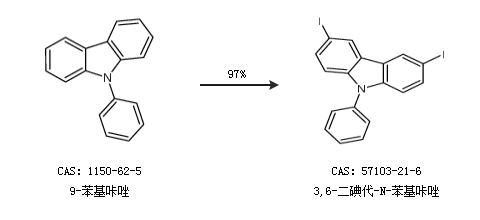 1.通過(guò)9-苯基咔唑合成3,6-二碘代-N-苯基咔唑,收率約97%;